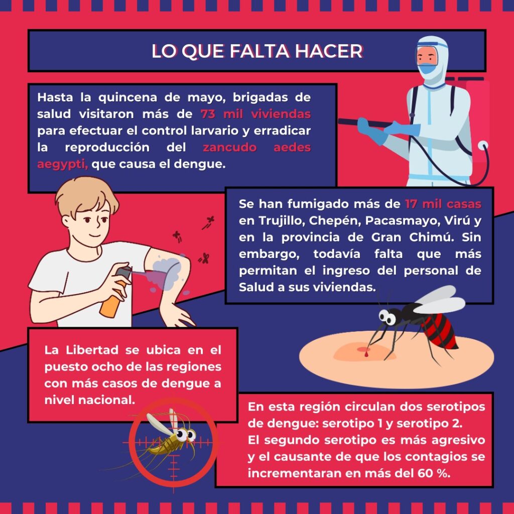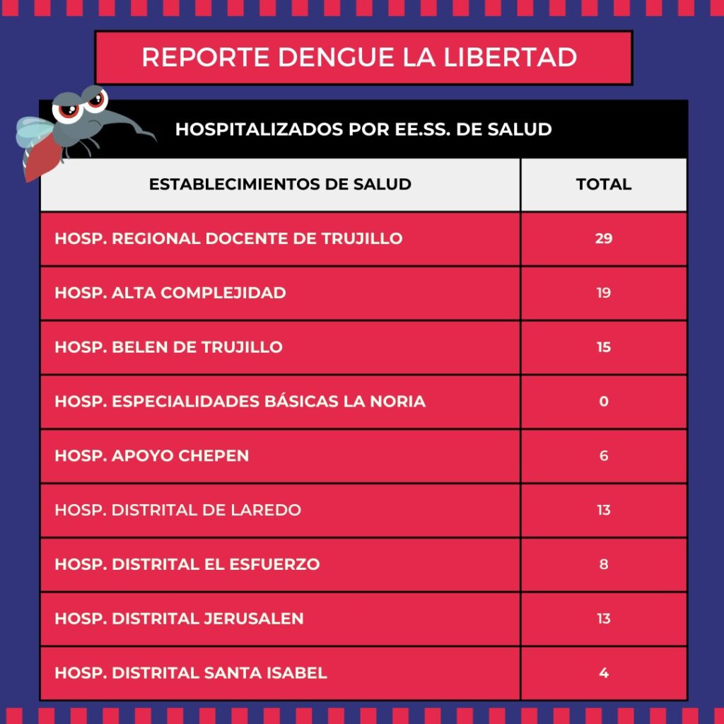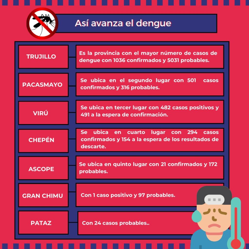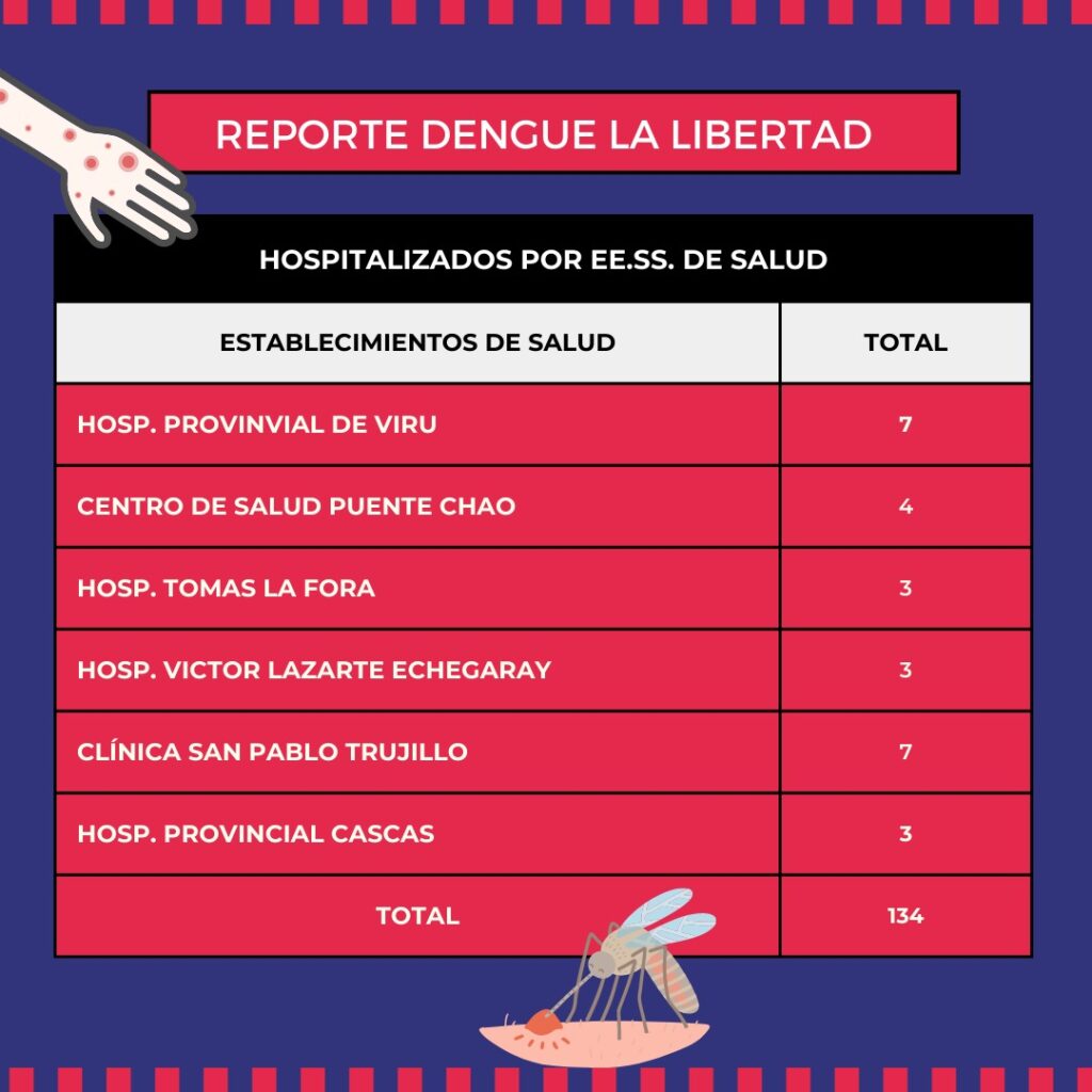 Ocho muertos y más de 8620 casos, entre confirmados y probables, es el reporte de la Gerencia de Salud sobre el avance del dengue en La Libertad. Hay 134 personas hospitalizadas, siendo las provincias de Trujillo, Virú y Pacasmayo, las que concentran el mayor número de contagios.