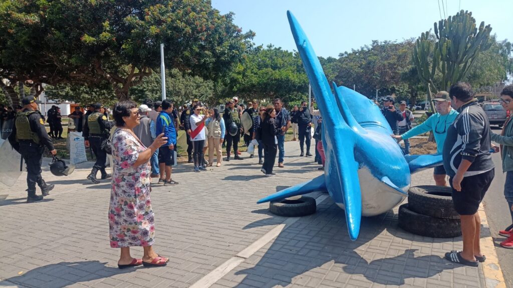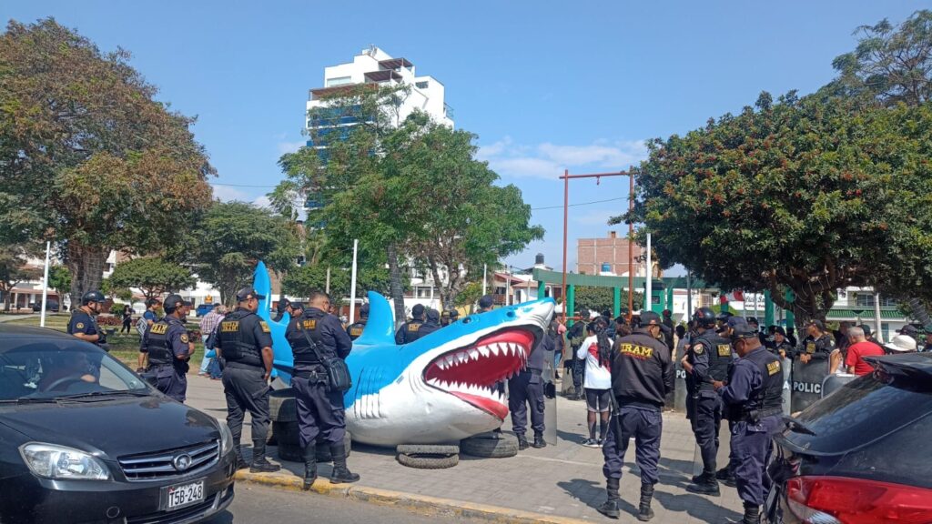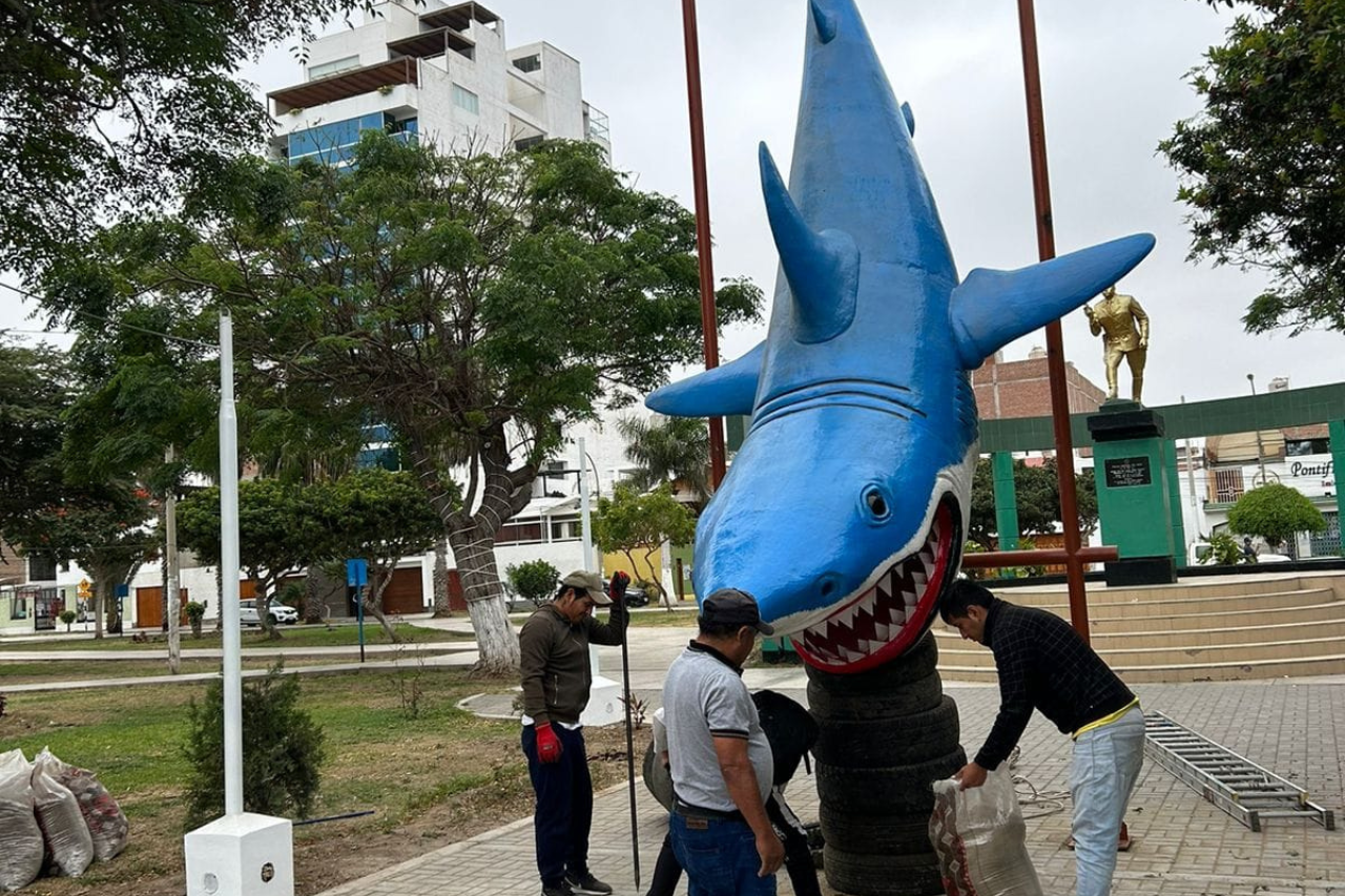 Pocas semanas después, la escena se repite, esta vez, en la urbanización El Recreo. Vecinos tuvieron un enfrentamiento con representantes de la municipalidad tras la colocación de una escultura de un tiburón de cinco metros en el parque Alipio Ponce, uno de los más concurridos de Trujillo.