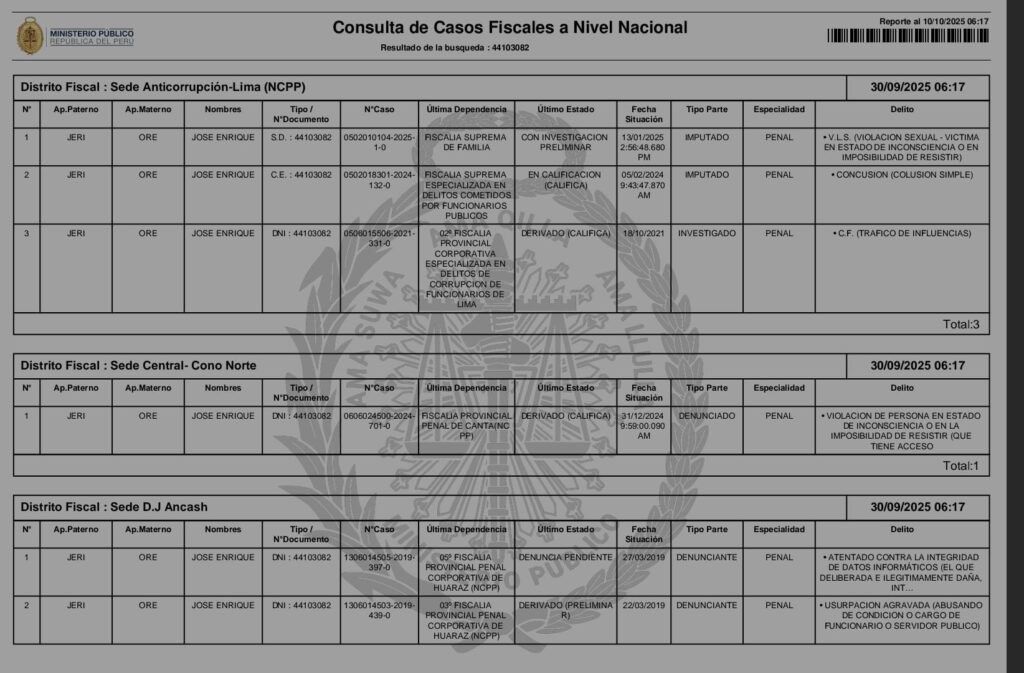 Jerí también enfrentó una investigación por desobediencia a la autoridad relacionada con la inasistencia a un tratamiento psicológico requerido por un juzgado civil debido al presunto caso de violación sexual.