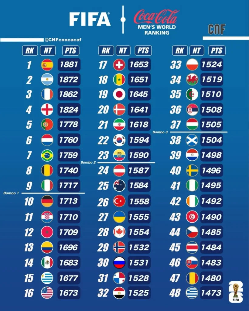 En el panorama global, España ocupa el primer lugar, seguida por Argentina, Francia, Inglaterra y Portugal, completando el Top 5 del ranking FIFA.