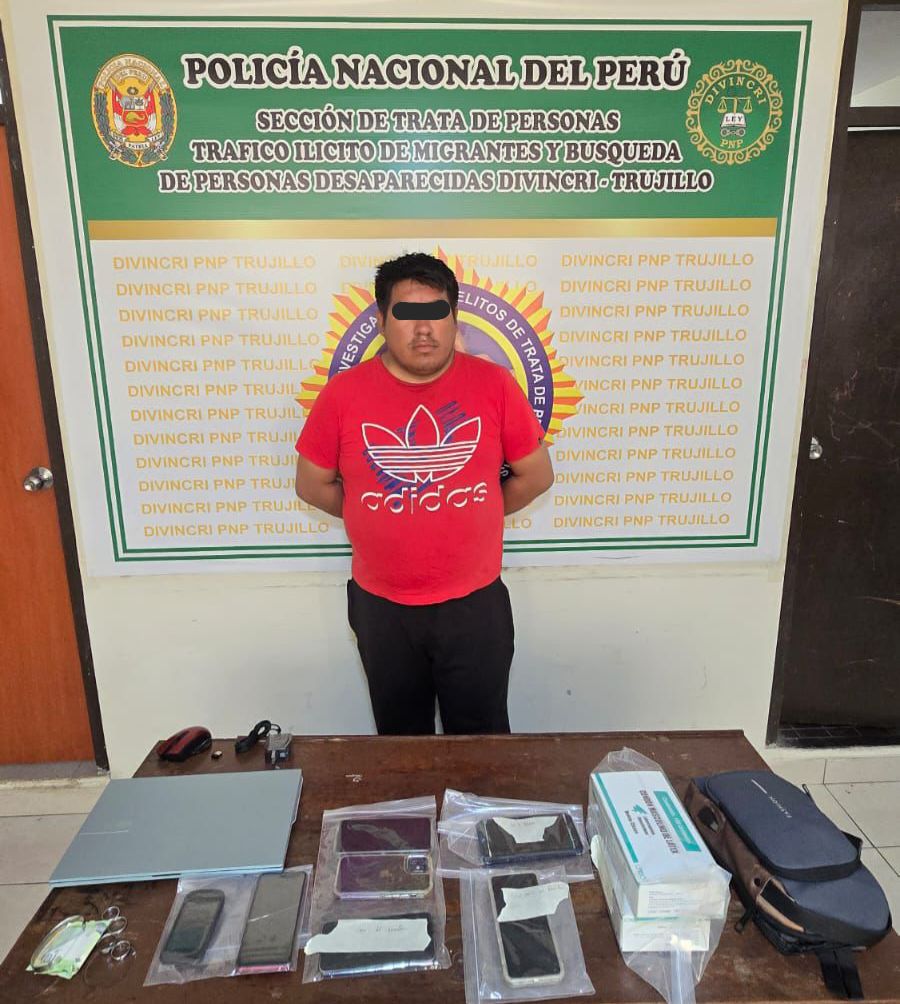 La captura se produjo tras el allanamiento de dos inmuebles ubicados en la av. América Sur y la Calle Leonardo Da Vinci, donde también se incautaron siete celulares, una laptop, preservativos y dinero en efectivo, pruebas que refuerzan la investigación.