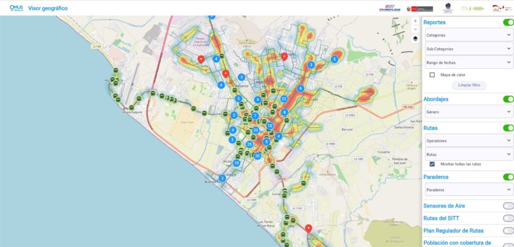 El Observatorio de Movilidad Urbana Sostenible (OMUS) es una plataforma digital pionera que gestiona datos de más de 1,200 kilómetros de rutas y 127 paraderos georreferenciados.