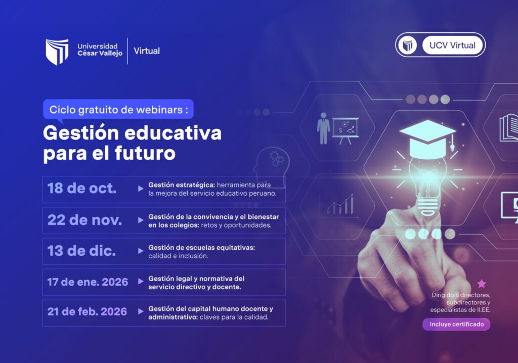 La Universidad César Vallejo (UCV) ha puesto en marcha el ciclo gratuito de webinars Gestión Educativa para el Futuro con el objetivo de fortalecer las capacidades de directores, subdirectores y especialistas educativos en todo el país.